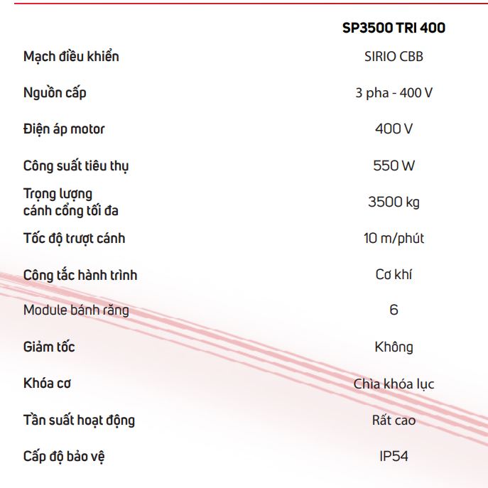 Cổng trượt động cơ điện 3 pha 400 V cho cánh cổng nặng tới 3500 kg, tốc độ trượt cánh 10 m/phút. Tích hợp U-link và công tắc hành trình cơ điện tử.