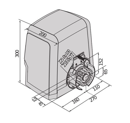 Động cơ 24 V cho cánh cổng trượt nặng tới 500 kg / 1000 kg, tốc độ trượt cánh lên tới 25 m/phút và 18 m/phút.