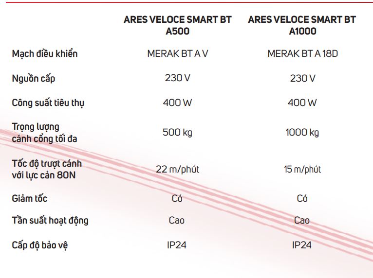 Động cơ 24 V cho cánh cổng trượt nặng tới 500 kg (model ARES VELOCE SMART BT A500) và 1000 kg (model ARES VELOCE SMART BT A1000) , tốc độ trượt cánh lên tới 25 m/phút (ARES VELOCE SMART BT A500) và 18 m/phút (model ARES VELOCE SMART BT A1000).